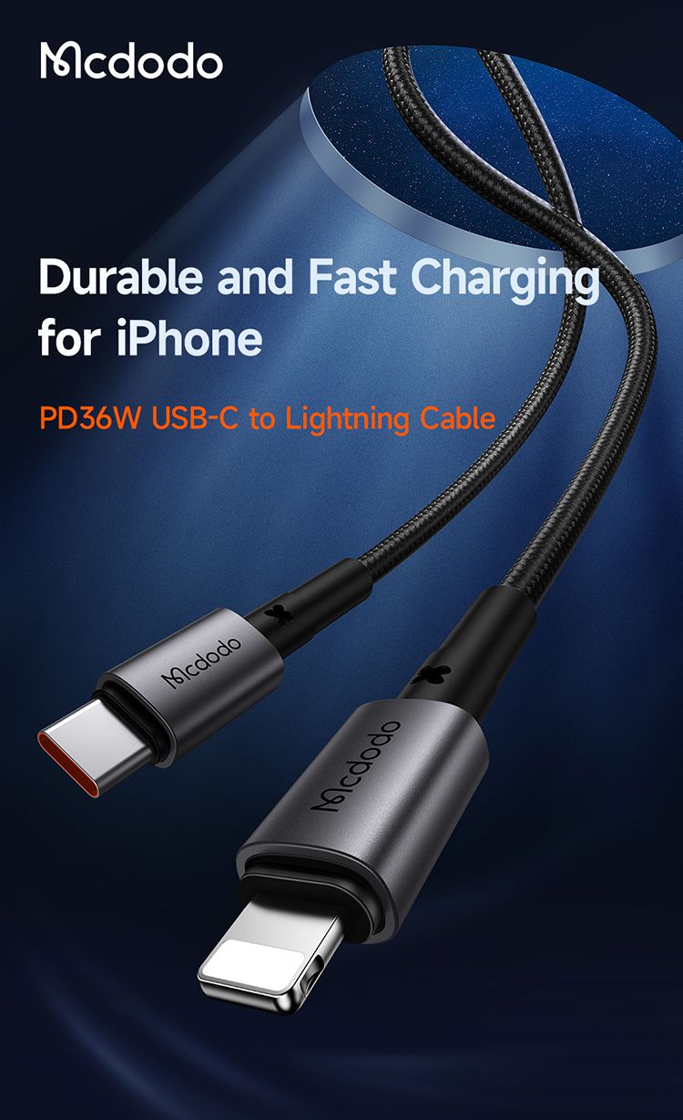از پورت USB-C به دستگاه های دارای درگاه لایتنینگ است . این کابل توسط شرکت Mcdodo طراحی و تولید شده است و قابلیت شارژ سریع و انتقال داده را فراهم می کند .